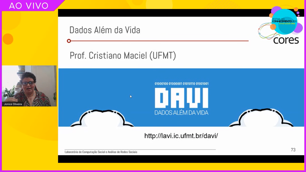 No dia 24/07/2020, no Festival do Conhecimento da UFRJ, ocorreu a palestra “Vamos discutir o papel e o impacto da Computação Social em nossas vidas”, com a profa. Dra. Jonice Oliveira, da UFRJ.