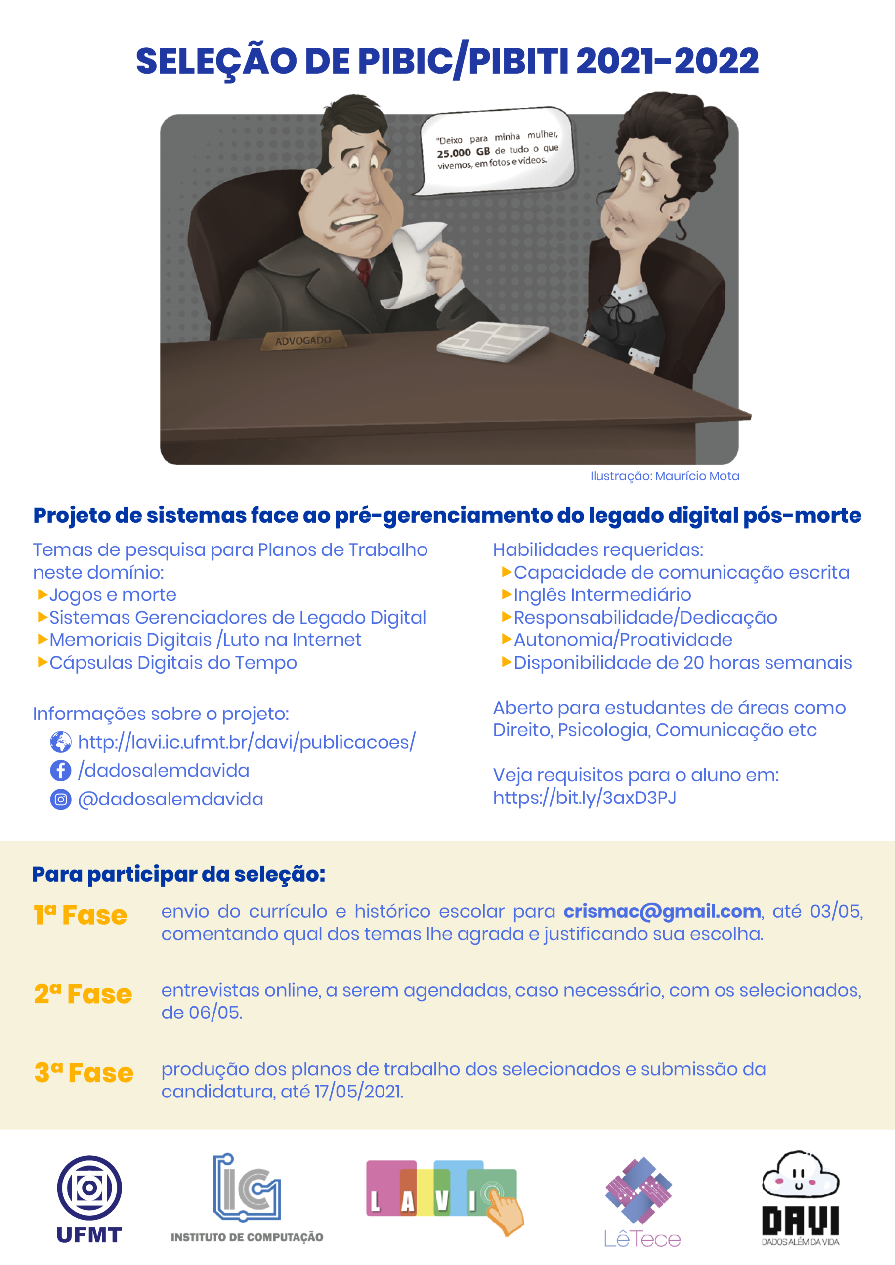 A quem possa interessar, está aberta chamada para seleção de bolsistas de Iniciação Científica (PIBIC/PIBITI) para 2021-2022, do projeto: “Projeto de sistemas face ao pré-gerenciamento do legado digital pós-morte”. Alunos da UFMT, venham fazer pesquisa conosco!